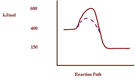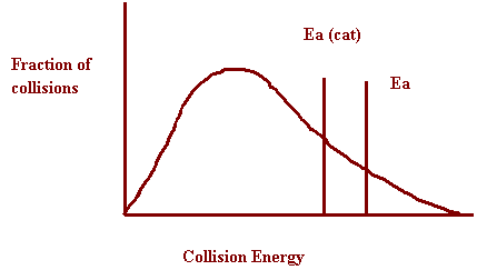 lowers the activation energy, allowing lower energy collisions to be