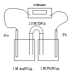 D. NO3- will migrate toward the Au half-cell and K+ will migrate toward the Pb half-cell